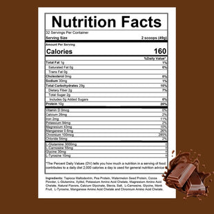 Ingredients: Tapioca Maltodextrin, Pea Protein, Watermelon Seed Protein, Cocoa Powder, L-Glutamine, Xylitol, Potassium Amino Acid Chelate, Magnesium Amino Acid Chelate, Natural Flavors, Calcium Glycinate, Stevia, Salt, L-Carnosine, Glycine, Monk Fruit, L-Tyrosine, Manganese Amino Acid Chelate and Chromium Amino Acid Chelate. Manufactured in a facility that processes Milk, Soy, Eggs, Peanut, Sesame, Shellfish, Tree Nuts and Wheat. |