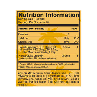 * The Percent Daily Values are based on a 2,000 calorie diet. † Daily Value not established. Ingredients: MCT Oil, Gelatin, Glycerin, Hemp-derived Extract (Broad Spectrum CBD), Mixed Tocopherols, (Vitamin E), Beta-Caryophyllene. Contains: Coconut Oil. Manufacturer processes other allergens. These statements have not been evaluated by the Food and Drug Administration. This product is not intended to diagnose, treat, cure or prevent any disease. |